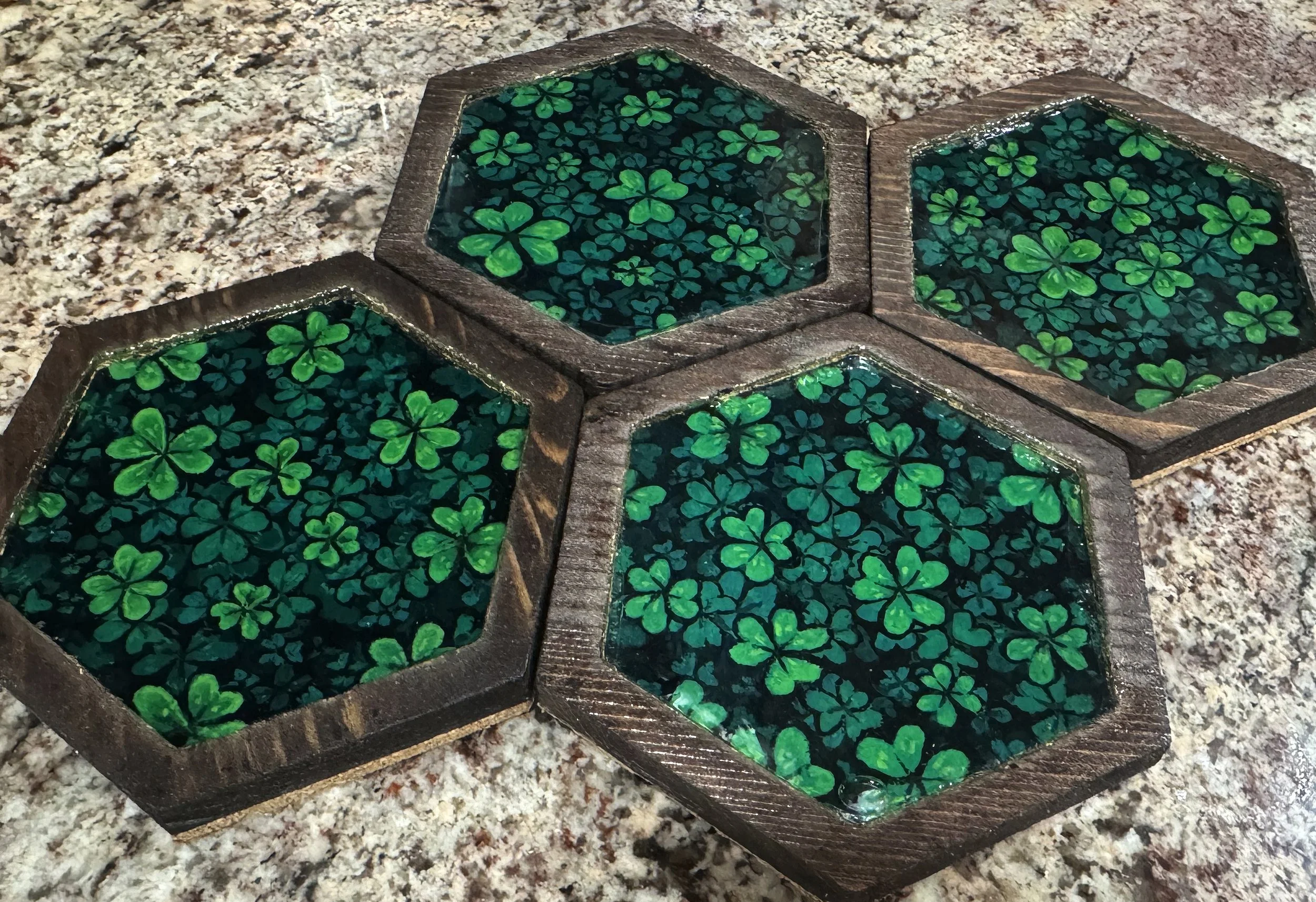 Once the clovers were painted, I could feel they were still missing something—an extra pop. Taking a chance, I decided to pour resin over the top. Not only would it protect the artwork from moisture, but it would also add a depth I couldn’t achieve with normal gloss varnish.